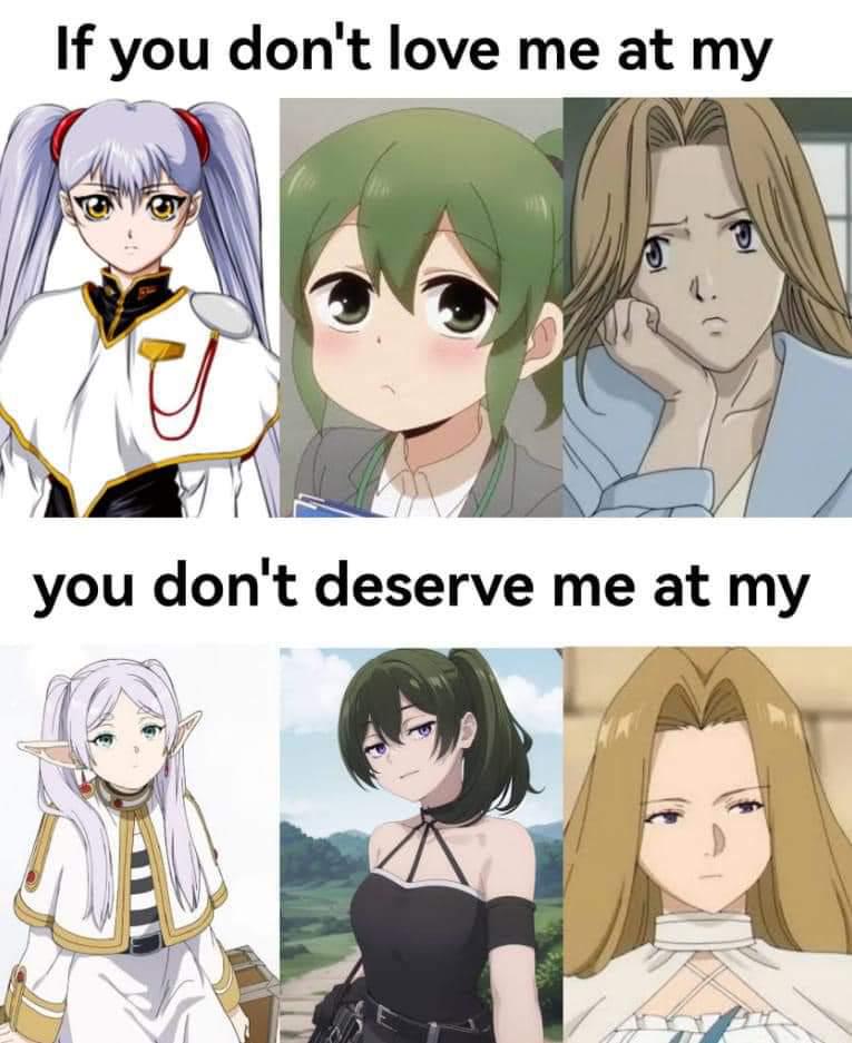 roomofbruh on July 23, 2024 10:58 am Above characters and series: Ruri Hoshino (Martian Successor Nadesico), Futaba Higurashi (My Senpai is Annoying), Nina Fortner (Monster) Below characters: Frieren, Übel, Methode. All three are from Frieren: Beyond Journey’s End.