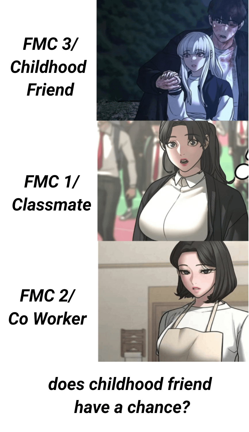 2. Turns out FMC 1/classmate is also a “childhood friend” and a “coworker” that FMC 3/childhood friend wasn’t aware of😭🙏
