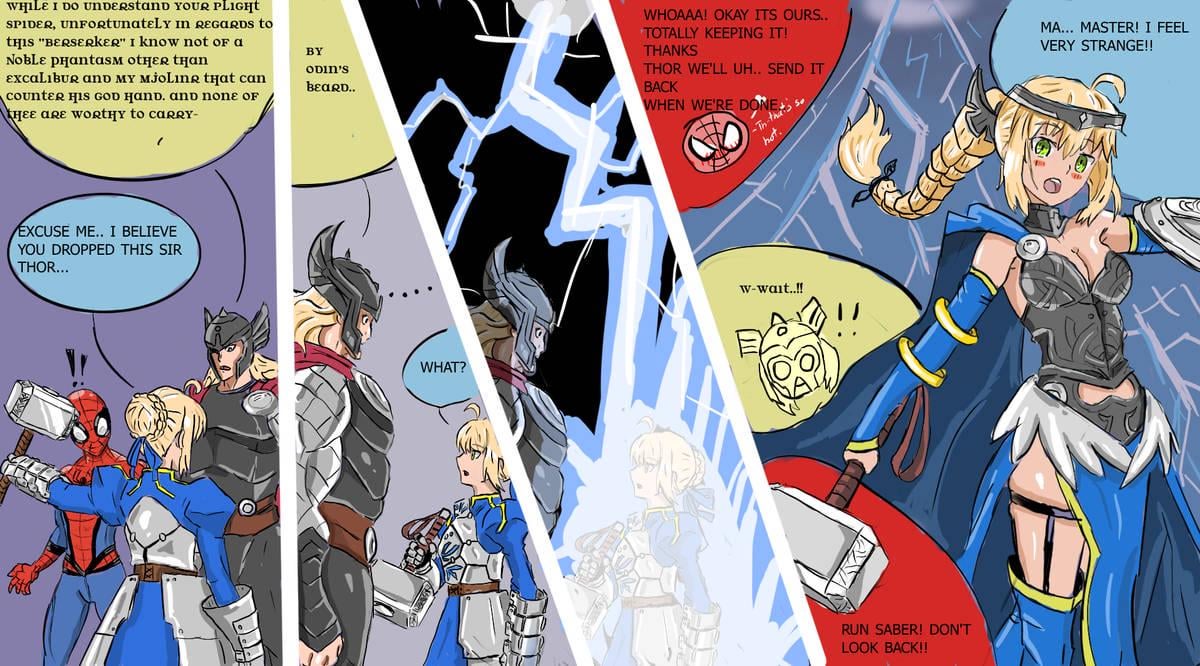 Marvel vs Fate Stay Night vs Spider-man. Saber is worthy to lift Thor’s Hammer. By MisakaLovesYou by CapAccomplished8072