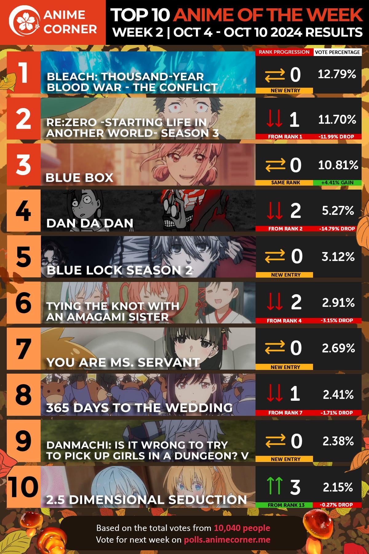 Iirc AnimeCorner really really loves Bleach so it’s likely to stay at the top as long as it is airing.